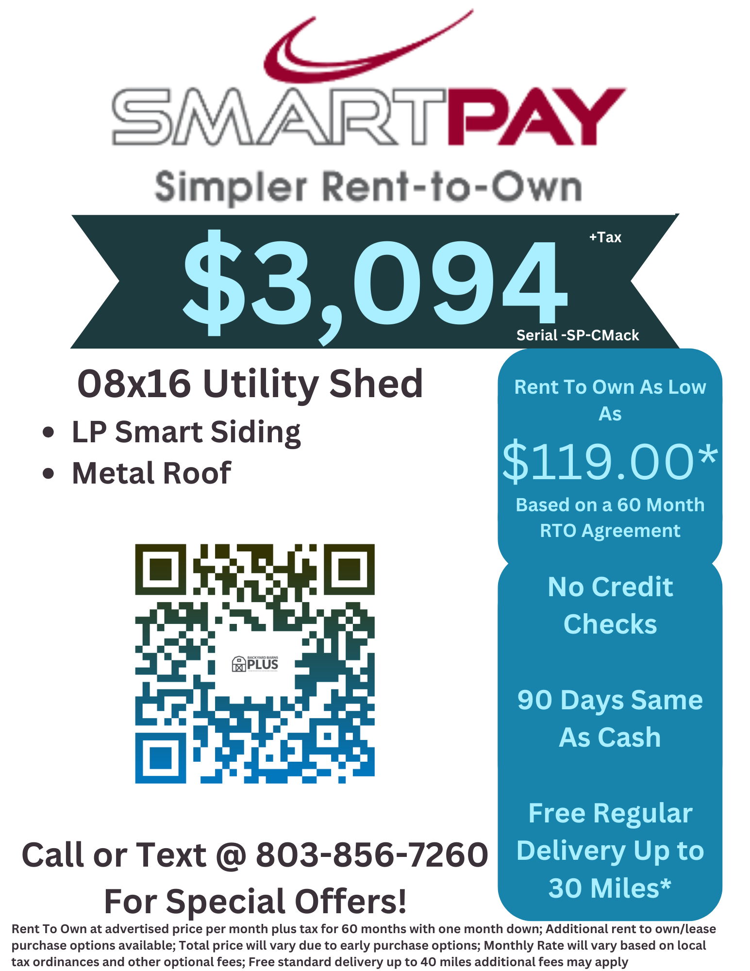 With our Rent-to-Own program, you can bring home this beautiful cabin-style shed today — no credit check required! Enjoy affordable monthly payments, 90 days same as cash, and free delivery within 30 miles.