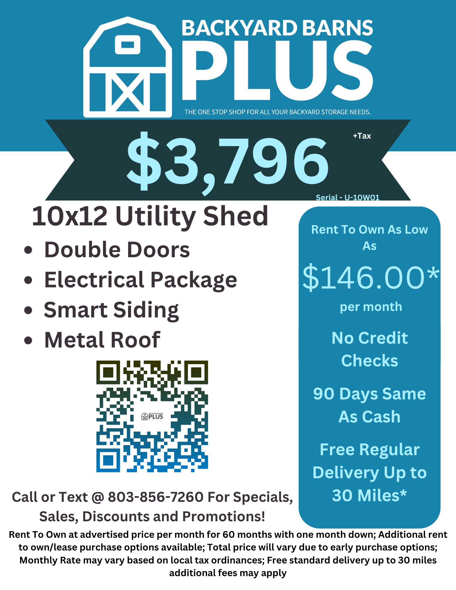 Upgrade your backyard with a dependable shed designed for both function and longevity. The 10×12 Utility Shed provides reliable storage with premium features that fit a wide range of needs — whether for lawn equipment, tools, or seasonal items.